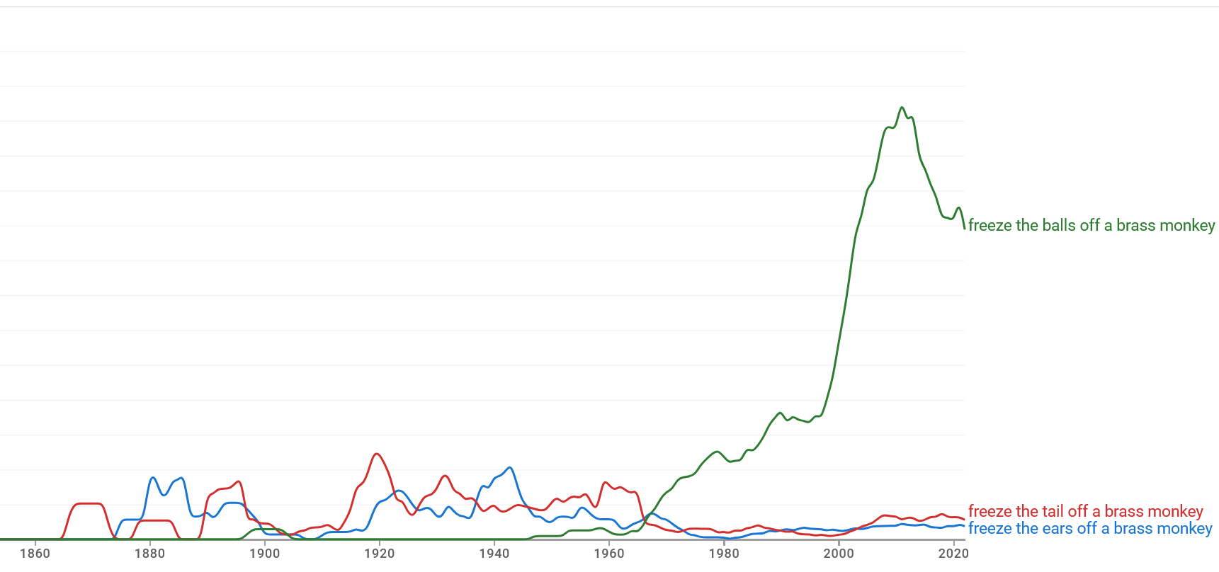 Google Ngram of various “brass monkey” phrases 25th March 2026 1721 × 808 Google Ngram of various “brass monkey” phrases Google Ngram of various “brass monkey” phrases